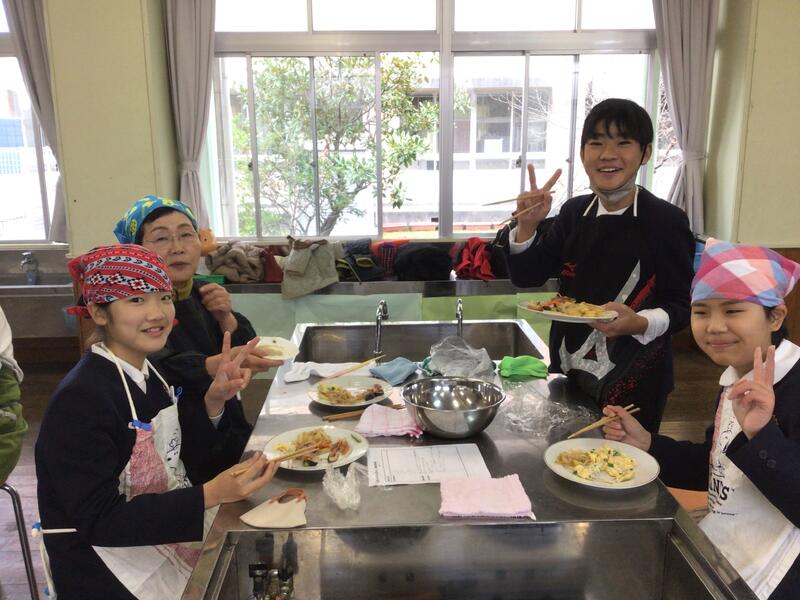 18日(水)の午前中に、調理実習を行いました。炒める・ゆでるの調理法を生かして、自分で考えた主菜を調理しました。できる限り自分の力で手早く調理することを意識して取り組みました。事前に使う調理器具・手順を確認しておきましたが、実際に材料を切ったり、炒めたりする際には、難しいことがいくつもあったようです。今回も婦人会の皆様にサポートをいただき、安全に美味しく調理することができました。婦人会の皆様、本当にありがとうございました。保護者の皆様も、材料の準備等でご協力いただき、本当にありがとうございました。