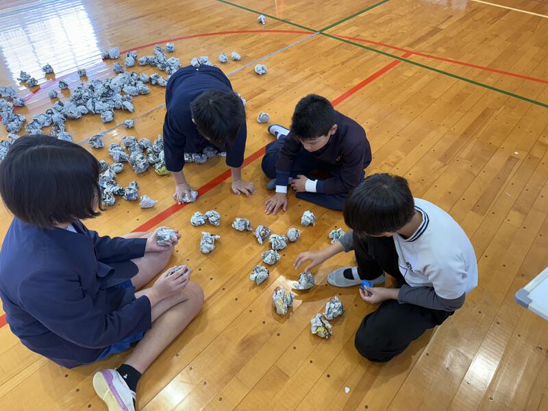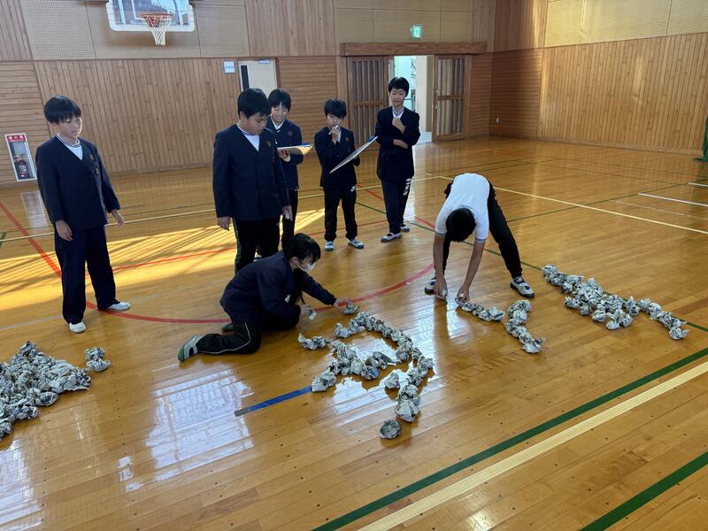 次に体育館に移動して「漢字あてゲーム」をしました。このゲームの進行係の人たちが試行錯誤しながらゲームのルールを考えてくれました!漢字作る人、漢字を答える回答者に分かれてチーム同士で対戦しました。タイムリミットもあるので、班のみんなと素早く協力して手分けしながらゲームに挑んでいました。