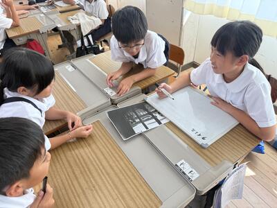 今回は、水俣の過去から現在の写真を見て、「いつ頃か、どこか、何をしているのか」をグループで話し合い、写真にタイトルをつける活動を行いました。この活動から、子供たちは水俣のことを知り、興味・関心を深めたようでした。