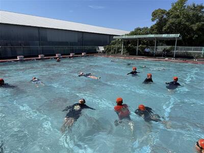 子供たちは、洋服で水に入ることの危険さや、もし誤って入ってしまったときの対応などを学びました。背浮きの練習も行い、力を抜いて浮くことの大切さを体験しました。
