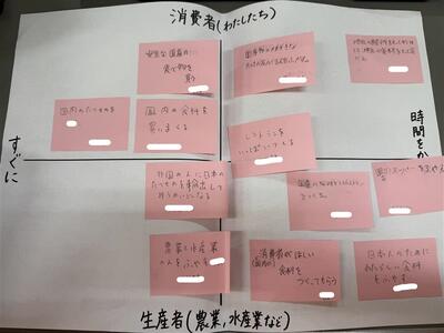 まとめの活動として、子供たちは、学習問題「国内の食料生産を発展させるには、どうしていけばよいだろう」に対して、学習後の自分たちの考えを出していきました。そして、「消費者・生産者」「すぐにできること・時間をかけてできること」のそれぞれの視点から考えを書きました。