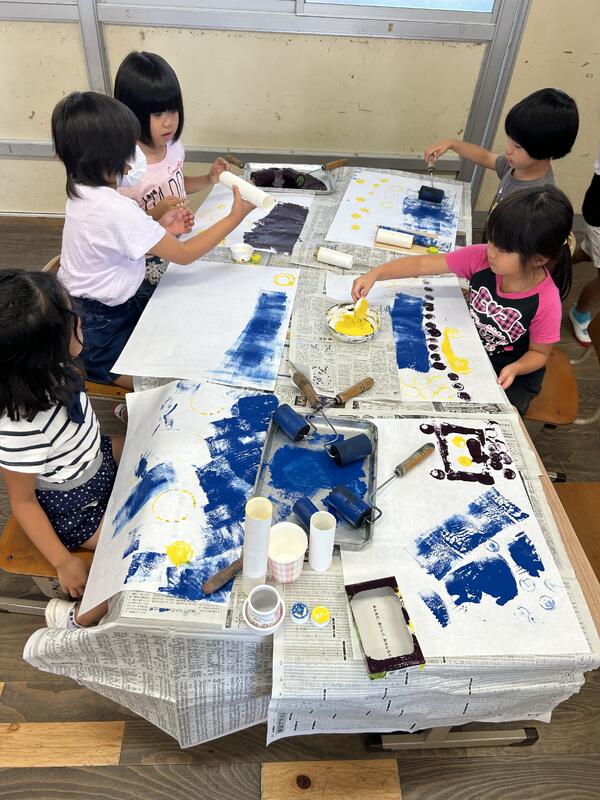 今回の図工では、トイレットペーパーの芯やカップなどの材料に絵の具をつけて、大きな紙にスタンプのように押したり、コロコロところがしたりして、自分の作品を作り上げていました。子どもたちは、家庭からもってきた材料を使って、自分なりに考えて表現していました。紙コップを使って花火を表現したり、丸をいくつも重ねてぶどうを作ったりするなど、たくさんの工夫が見られました。