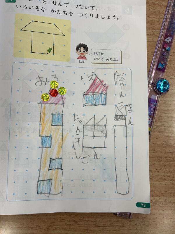 算数は、かたちづくりという学習に入りました。赤、黄色、青、緑、の4色の色板を使って、まずは教科書の形と同じように並べてみました。その後は、自分の好きな形に色板を並べました。上記にある写真では、王冠、ホテル、うさぎ、など自分で想像したものを丁寧に作り上げていました。