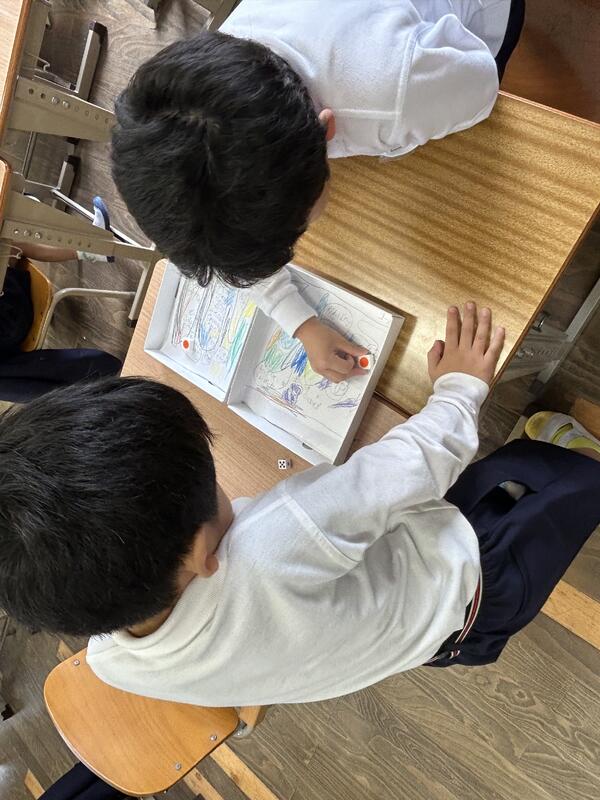 おうちから持ってきていただいた空き箱を広げて、その形から想像する絵を描く学習をしました。