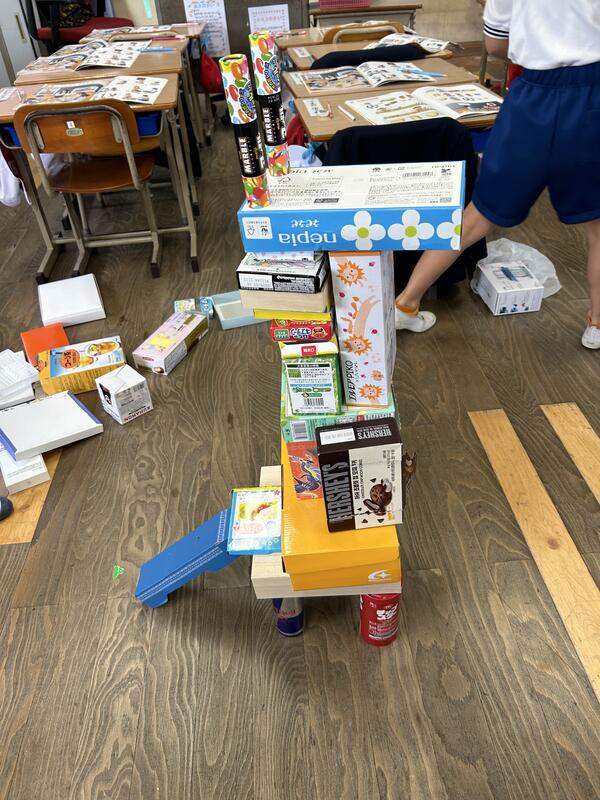 「いろいろなかたち」の学習のはじめは、グループで一つの形を作る、というものでした。グループの中で、何を作るか真剣に話し合っていました。あるグループは、「きりんをつくる」と決め、上手にできていました!