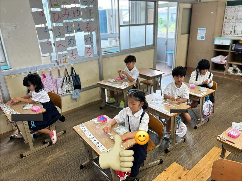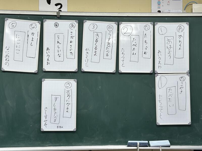 教科書にのっている「あいうえおうた」をもとに、子どもたちもオリジナル「あいうえおうた」を作りました。初めて班で話し合い活動をしました。話し合って決まった「あいうえおうた」を、ミニホワイトボードに書いていきました。初めての作業でしたが、みんな真剣に考え、真剣に話し合っていました。