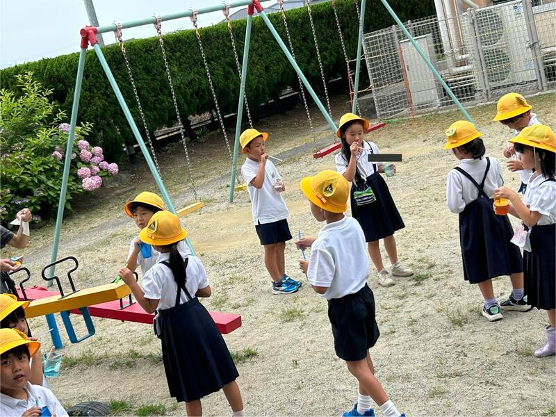 生活科の学習で、シャボン玉をしました。まずは、コップの中にシャボン玉液を入れて、ストローで小さいシャボン玉をたくさん作りました。その後、針金ハンガーで作ったもので、大きなシャボン玉作りに挑戦しました。コツをつかむと、大きくて長いシャボン玉を作れるようになっていました。