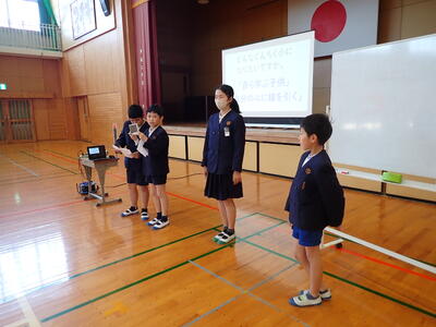 続いて、運営委員の子供たちが、学校教育目標を受けた児童会テーマをつくることを提案し、全児童からそのキーワードを募りました。児童会テーマは、このキーワードをもとに後日示されるそうです。