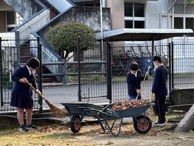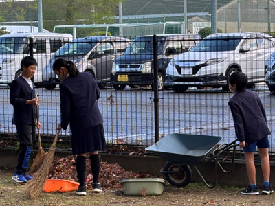 令和7年4月21日(月)、今朝も6年生の子供たちが学校の隣にある郡築神社の境内の清掃に励んでいました。これは、本校の伝統となっているもので上級生がボランティアで行っています。