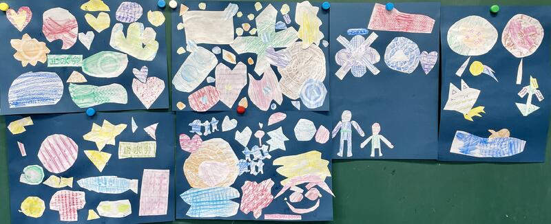 4時間目は、こすり出した紙を好きな形に切って、作品を作りました。こすり出しをいかした楽しい作品ができました。