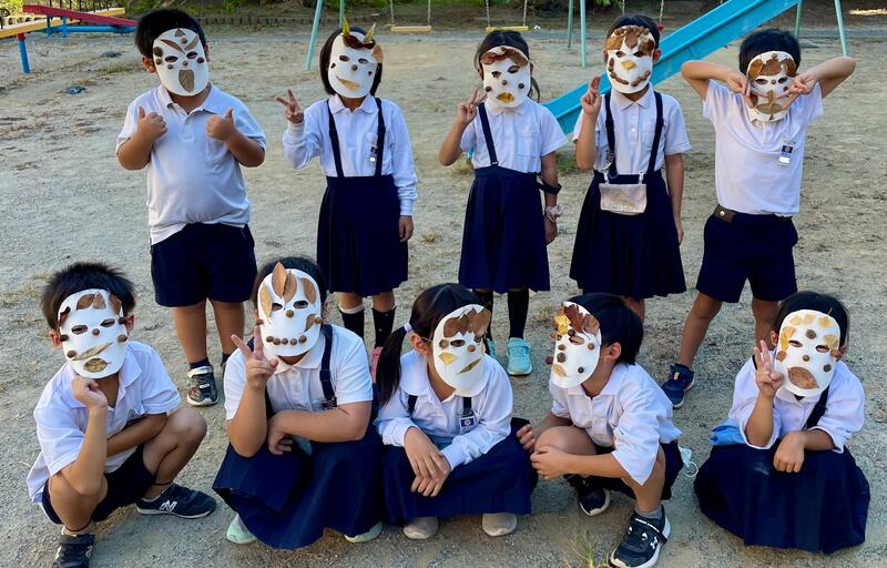 19日(木)にみんなで記念写真を撮りました。その後、お面をつけて楽しく遊んでいるところをペアの人にタブレットで撮ってもらいました。面白い写真がたくさん撮れました。20日(金)に写真を発表ノートに貼り付けて、振り返りを書き、お面づくりのまとめをします。