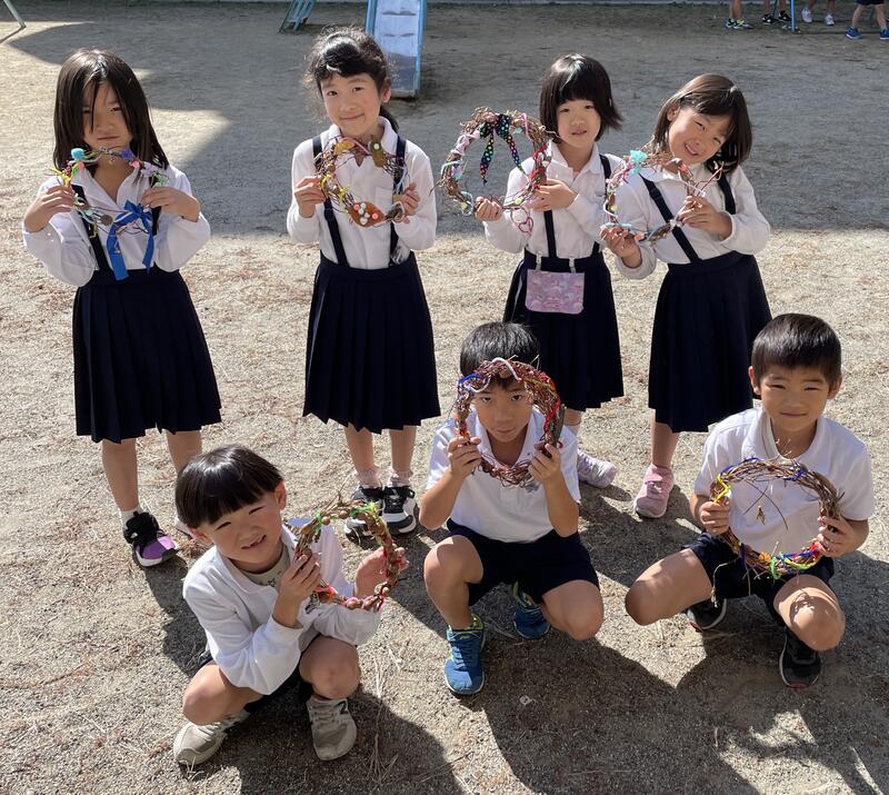 生活科の学習で、はっぱやどんぐりを集めて秋のお面を作りました。はっぱを髪の毛にしたり、どんぐりで口を作ったり…。思い思いにはりつけて、世界に一つだけのすてきなお面ができました。