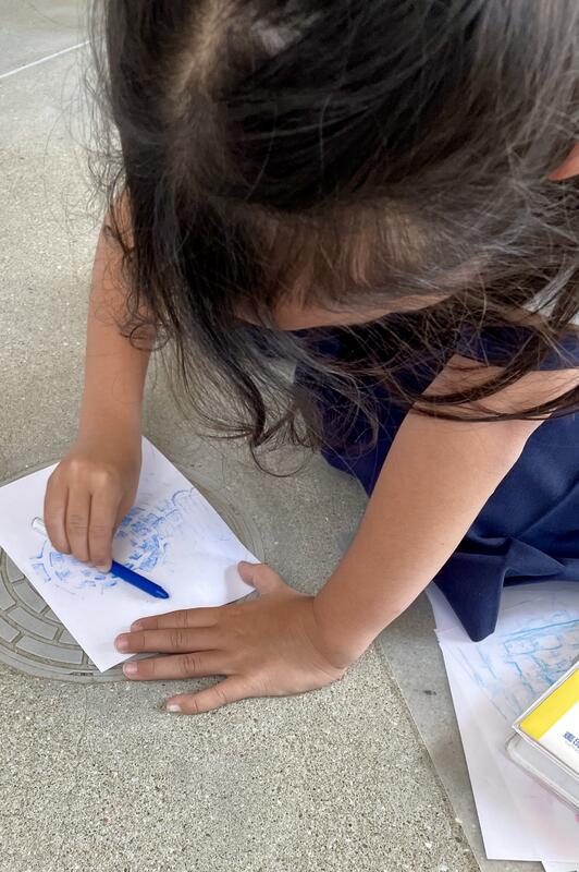 身の回りの様々なものや場所からでこぼこを探し 出し、色鉛筆でこすり出してその面白さを体験しました。みんな、あちこちのでこぼこを探し出し、写し取って見せあっていました。