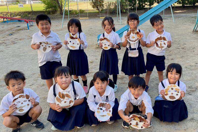 生活科の学習で、はっぱやどんぐりを集めて秋のお面を作りました。はっぱを髪の毛にしたり、どんぐりで口を作ったり…。思い思いにはりつけて、世界に一つだけのすてきなお面ができました。