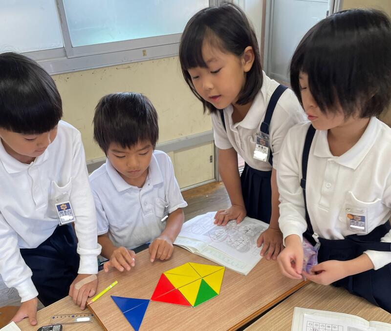 正方形のマスを手がかりに、ミニ定規を使って線を引き、三角形の枚数を調べることができました。