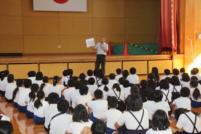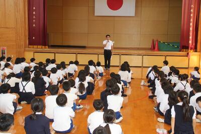 不審者対応の避難訓練を行いました。PTA役員の方に不審者役になっていただきました。児童は校内放送をしっかり聞いて迅速に避難場所に移動することができました。校長先生や安全教育主任から「いかのおすし」や防犯ブザーの大切さなどについて話がありました。自分の命を自分で守ることについて考える機会になりました。不審者役をしてくださったPTA役員の皆様、ありがとうございました。