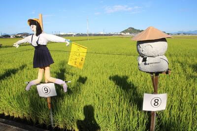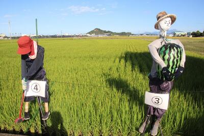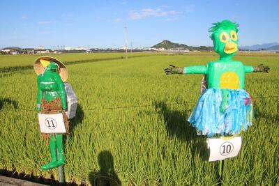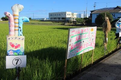 本校の正門前に3・4年生が田植えを行った水田があります。そこに、13体のステキなかかしが並んでいます。これは、郡築まちづくり協議会が開催したかかしコンテストの作品です。各町内でテーマを考えて製作されたもので、見る人を笑顔にしてくれます。かかしコンテストに関わった全ての皆様、ありがとうございました。