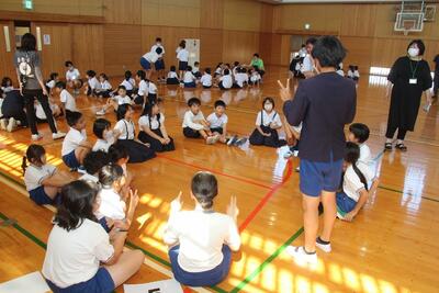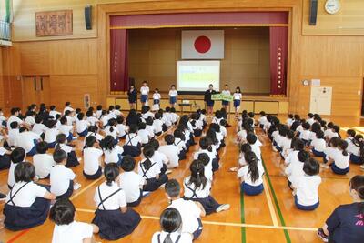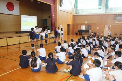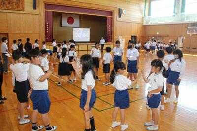 児童集会を行いました。今回は、仲間づくり委員会の発表と縦割り班活動を行いました。仲間づくり委員会の発表では、「助け合い、思いやりのある 笑顔いっぱいの郡築小学校」をめざして、次の具体的な行動目標が示されました。①困っている人がいたら助けよう。②いじめや差別をしない。③相手の気持ちを考えて行動しよう。この行動目標を各クラスで実践します。縦割り班活動では、「サインであいさつ」をしました。6年生を中心に班でのあいさつを考えました。ハイタッチやグータッチ・手を振るなど自分たちで考えたあいさつをして楽しみました。異学年での交流を通して、みんな笑顔になりました。