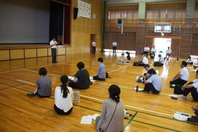 6月17日のプール開きに備えて、八代消防署の方を講師に招いて教職員を対象にした救急救命講習を行いました。意識の確認、救急車とAEDの手配、胸骨圧迫をやり続けることをしました。八代消防署から本校まで救急車が到達するまでに約7分間です。万が一に備えて、7分間やり続ける大切さを改めて確認しました。子どもたちの大切な命を守るために、私たちは頑張ります。
