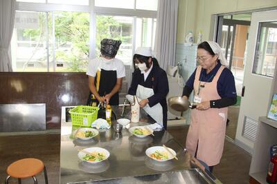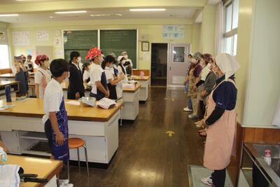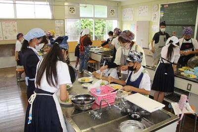 6年生が野菜炒めとスクランブルエッグの調理実習を行いました。実習の支援と安全見守りのために、地域サポーターの方が7人参加してくださいました。子どもたちは安心して包丁やガスコンロを使って調理ができました。後片付けの裏技を教えていただいた班があり、使った後の調理台やガスコンロ周りがピカピカになりました。地域サポーターの皆様、ありがとうございました。