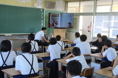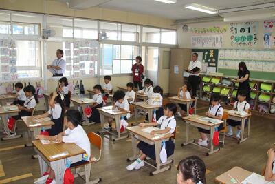 朝の読み聞かせを先生たちが行いました。ふだん授業に入らない校長先生や事務室の先生、担任以外の先生が各教室に行って読み聞かせをしたので、子どもたちは目を輝かせて本の世界に入り込んでいきました。