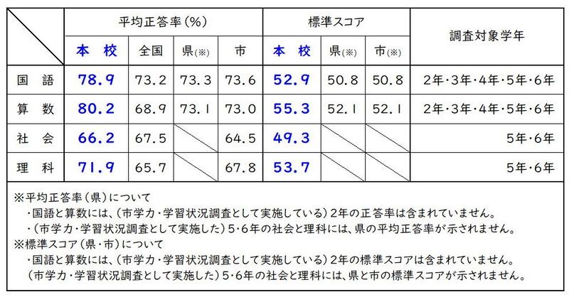本校の学力は、全国や県、市の平均正答率比及び標準スコアから見て、良好であることが分かりました。