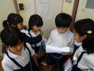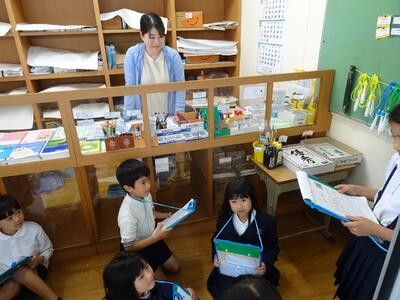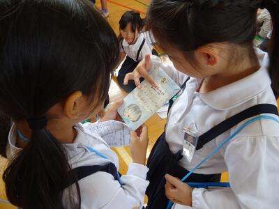 1・2年生の生活科で「学校たんけん」を行いました。1・2年生を7つのグループに分け、校舎内の13カ所をグループごとに自分たちで見学していく学習です。この日のために、2年生は事前の見学や説明、全体会の進行、名刺の作成、1年生へのプレゼントなど準備してきました。当日は、2年生が1年生を優しくリードして、案内したり説明をしたりして、学校の13カ所について学習しました。この活動を通して、2年生の自己有用感が高まり、1年生は次は自分たちの番だと自覚できました。みんな笑顔になりました。2年生の皆さん、ありがとうございました。