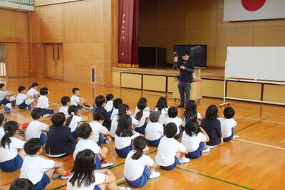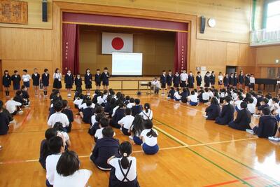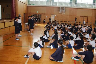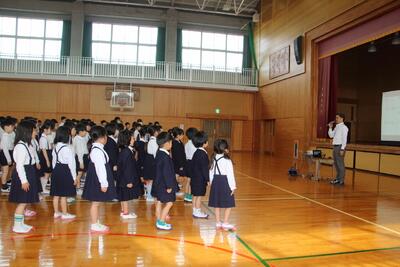 児童集会を体育館で行いました。今回の集会では、各委員会の委員長の紹介・児童会スローガンの発表・運動会応援リーダーの紹介・運動会スローガンの発表などを行いました。6年生が中心となって、この集会の企画・運営などを行いました。特に、児童会や運動会のスローガン発表までには、みんなから意見を吸い上げ、話し合いを何度も重ね、折り合いをつけながら一つにまとめ上げるために、いろいろな困難なことがあったと思います。この経験を通して6年生が一歩成長し、みんなを笑顔にし、学校をさらに豊かにしてくれました。6年生に皆さん、ありがとうございました。