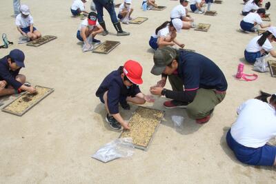本校では、3・4年生が総合的な学習の時間に米作り体験学習を行っています。この日はJAやつしろ郡築青壮年部や職員の皆様20人を講師に、種まきを行いました。はじめに体育館で代表のT様に米作りについての説明やDVD視聴を行いました。その後、運動場で一人一箱の種まきを行いました。土の入った箱に手作業で種(籾)をまいていきま、その上に土を均一にかぶせていきました。今後、生長した苗を水田に植える予定です。食の大切さや農業のやりがいなどについて学んでいきます。米作りを種まきから体験でき、しかも一人一箱もできる機会は郡築校区の強みだと思います。JAやつしろ青壮年部・職員の皆様、ありがとうございました。