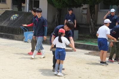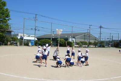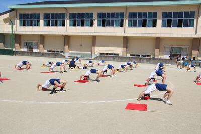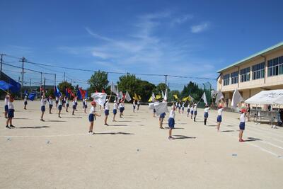 運動会に向けて5・6年生が表現運動の練習をしています。組体操では、腕立てやブリッジなどの個人技や、扇などの集団技などをやっています。また、旗を使った集団での演技を行っています。汗や泥にまみれ、痛さやつらさを乗り越えて、みんなで力を合わせて一つの作品を作り上げています。本番では、家族や地域の方に自分たちの演技で勇気や感動を届けられるとうれしいです。体育服の洗濯や児童の体調管理などで支えていただいている保護者の皆様、ありがとうございます。