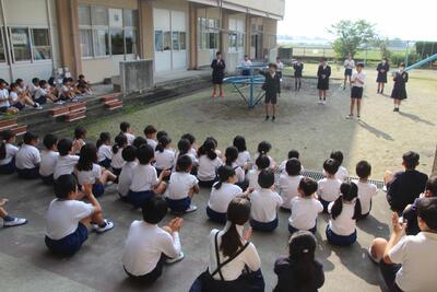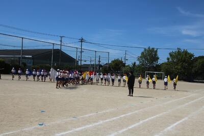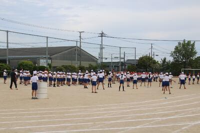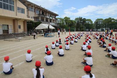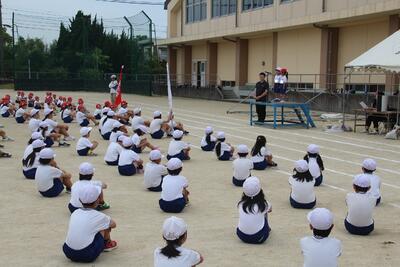 運動会の全体練習の1回目を行いました。入場行進・開会式・応援合戦などを行いました。始めに「練習のめあて」を決めて活動しました。今日のめあては話の聞き方と返事です。指令台に上がった人を見て話を聞いたり返事をしたりしました。応援合戦では、6年生の応援リーダーの説明をしっかり聞いて、みんなで声を出したり動きをそろえたりしました。郡築っ子全員でめあてを達成し、運動会をつくっています。