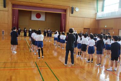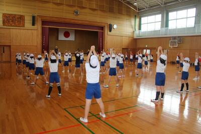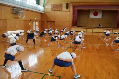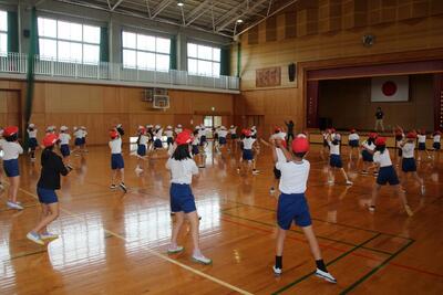 5月26日の運動会に向けて3・4年生が表現運動の練習を行いました。4年生と3年生がペアになり教え合いながら活動しています。一つ一つの動きの確認をして、みんなで音楽に合わせて通しました。止める・ゆっくり・速く・高く・低くなど動きに気をつけて活動しました。表現運動では、へそと髪の毛を動かすのがポイントです。3・4年生がそのポイントを意識しながら、一生懸命活動しました。