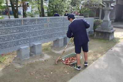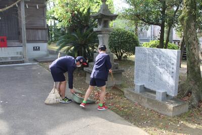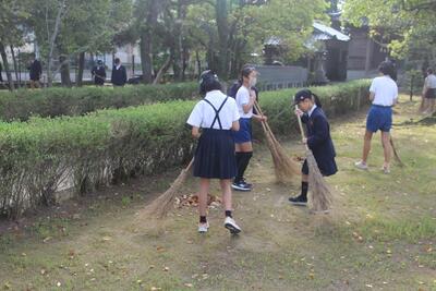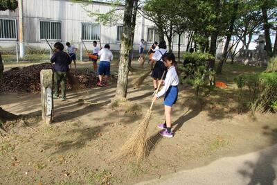 本校のすぐ隣に郡築神社があり、そこには多様な木々が植えてあります。神社内はもちろん本校の駐車場にまでたくさんの葉が散乱する場合があります。郡築小学校では、登校後から始業までの間、高学年児童がボランティアで落ち葉の掃除をしています。この日は、6年生の男子4人と多数の5年生が自主的に活動をしてくれました。地域のために汗を流す姿がとてもステキです。「郡築、だいすき」 ふるさとを愛する心が培われる学校の伝統となっています。