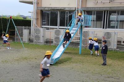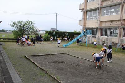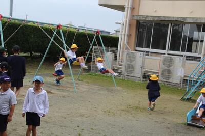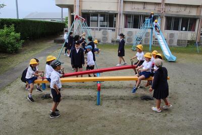 家庭訪問が終わり5時間授業になったこの日、1年生にとって学校生活で初めての昼休みがやってきました。1年生は朝から興奮していました。給食後の歯磨きや後片付けを終えて、1年生全員中庭に出て遊具等で遊びました。安全見守りのために6年生や他学年の人が一緒に、シーソーやブランコ、鉄棒・滑り台・砂場等で自由に遊びました。笑顔いっぱいの1年生でした。