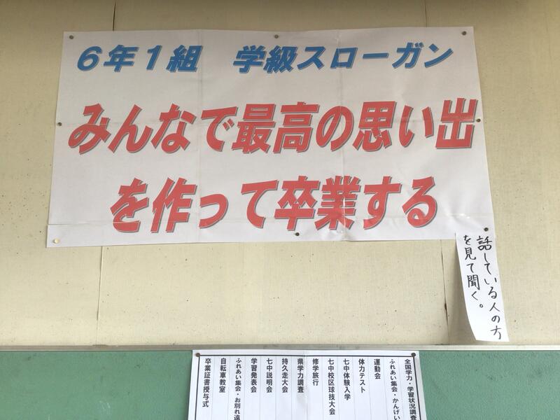 23日(水)に、学級スローガンを決定しました。その結果、「みんなで最高の思い出を作って卒業する」に決定しました。素晴らしいスローガンができたと思います。学習面・生活面(行事)において、最高の思い出になるとはどうすることなのか、一緒に考えながら、毎日意識して生活してほしいと思います。