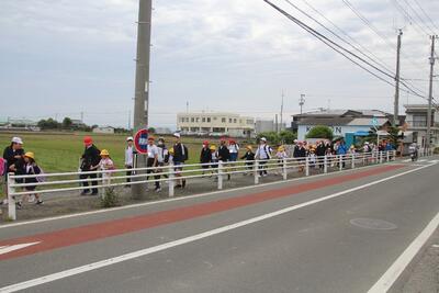 6年生と一緒に歩く1年生 |