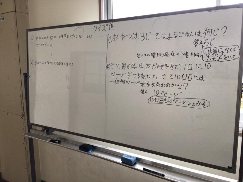 クイズ係は、廊下のホワイトボードに記入して出題しています。みんなへ一斉に出題すると、すぐに答えが分かってしまう可能性があるため、ボードを見ることで、それぞれが考えてもらうようにしているとのことです。答えは