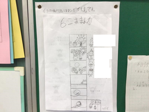 イラスト係は、定期的に6コマ漫画を考え、掲示しています。朝の会に、見てくださいと呼びかけているので、休み時間に、見に来ています。
