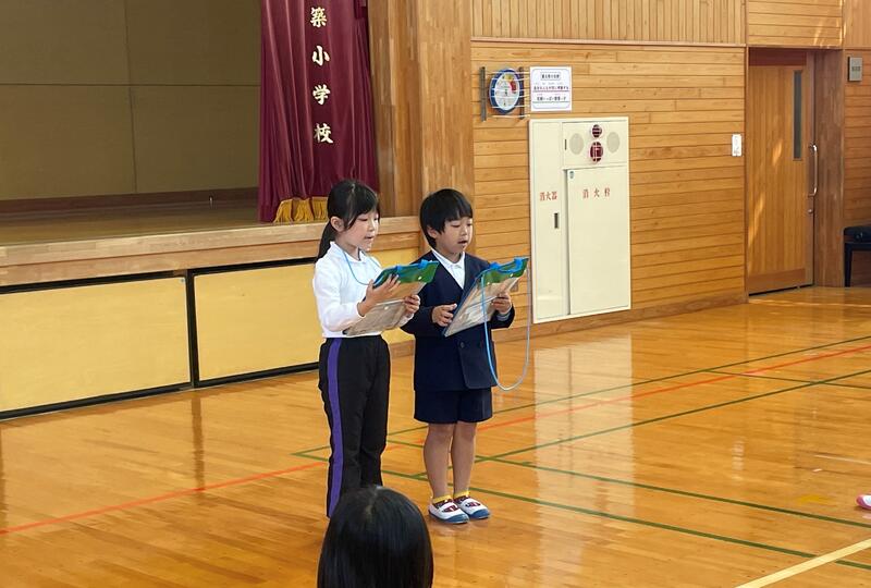 2年生は、1年生のときに育てたアサガオの種とアサガオのたたき染めをプレゼントしました。