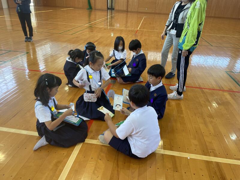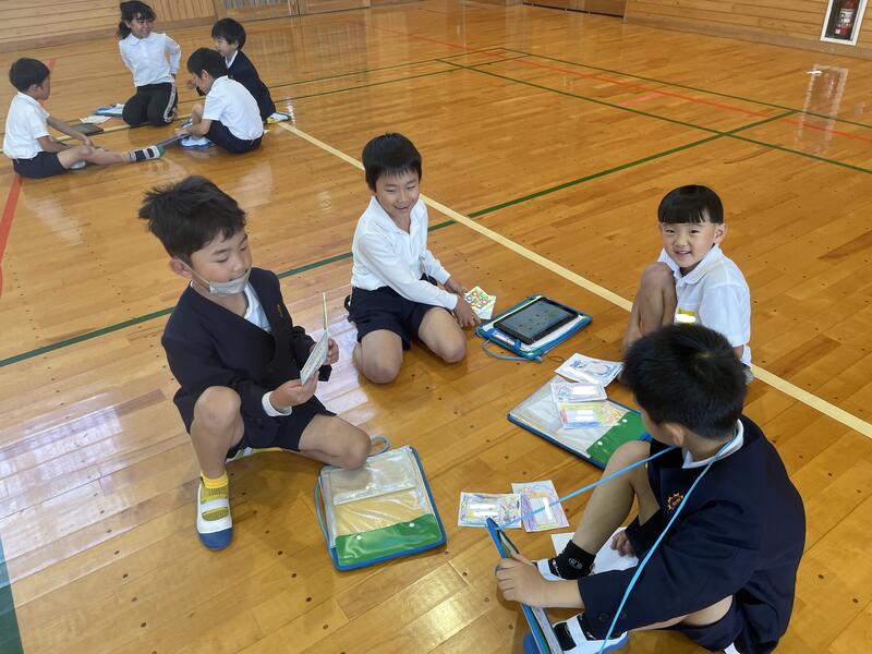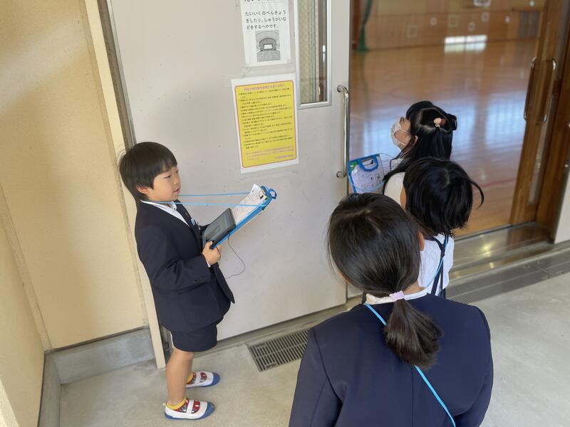 この日のために2年生は、学校のさまざまな教室の使い方について調べたり、お世話になる先生方に取材をして、1年生に伝えたいことを考えたりしてきました。今回は、教室の案内をしながらタブレットでクイズを出しました。探検の前には互いに緊張した顔をしていた子供たちも、探検後に体育館に戻ってくる頃には、すっかり仲良くなったようです。