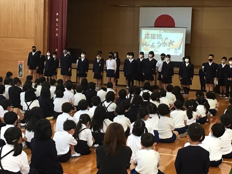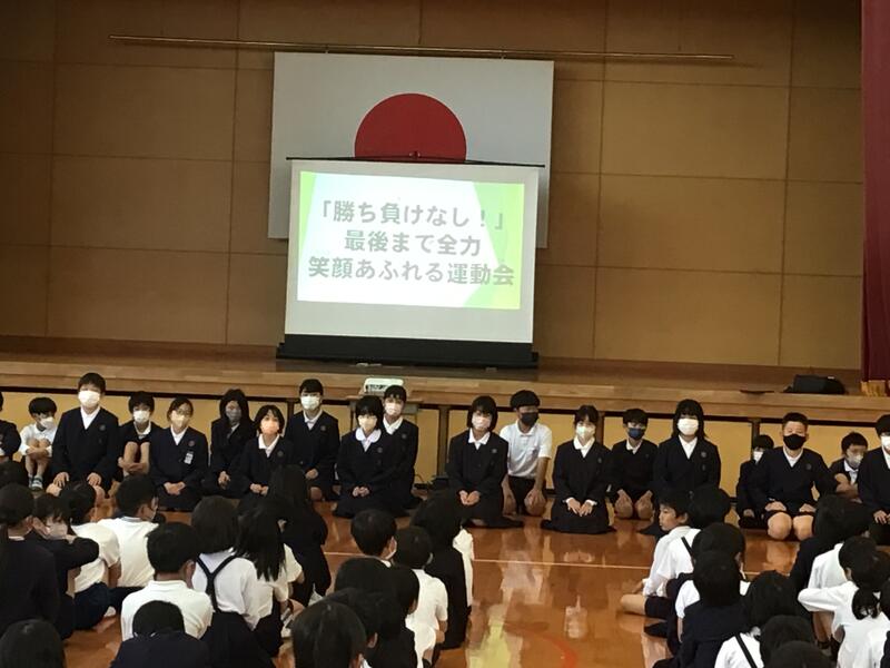 2日(火)の朝から、体育館で結団式がありました。各団の団長からの挨拶や運動会スローガンの発表がありました。