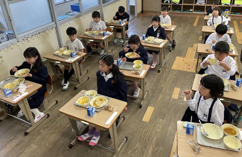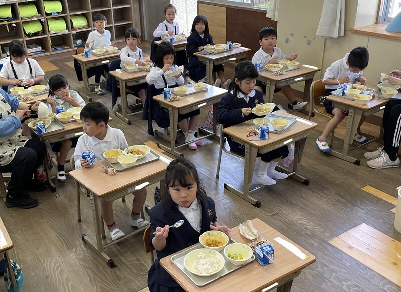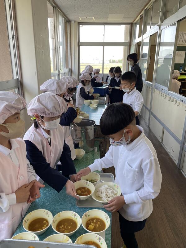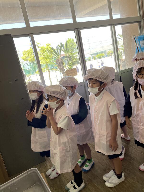 4時間目の後半に「当番のしかた」「待ち方」「おかわりのルール」「食べ終わったら」の4つのきまりを学習しました。そして、いよいよ準備開始!それぞれの園で、年長さんとしてお手本になってきた子どもたちです。きまりを守って上手にできました。