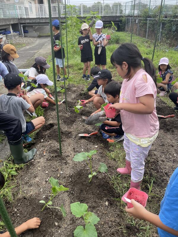 2年生は生活科の学習で、夏野菜を育てます。今回は、キューリ、なす、おくら、ピーマンを植えました。
