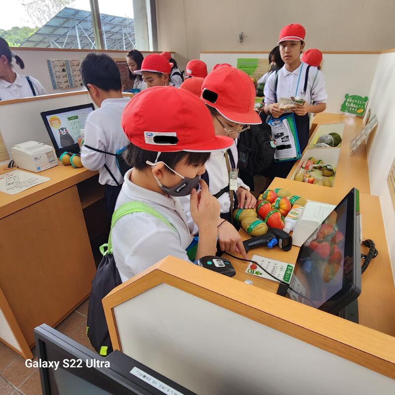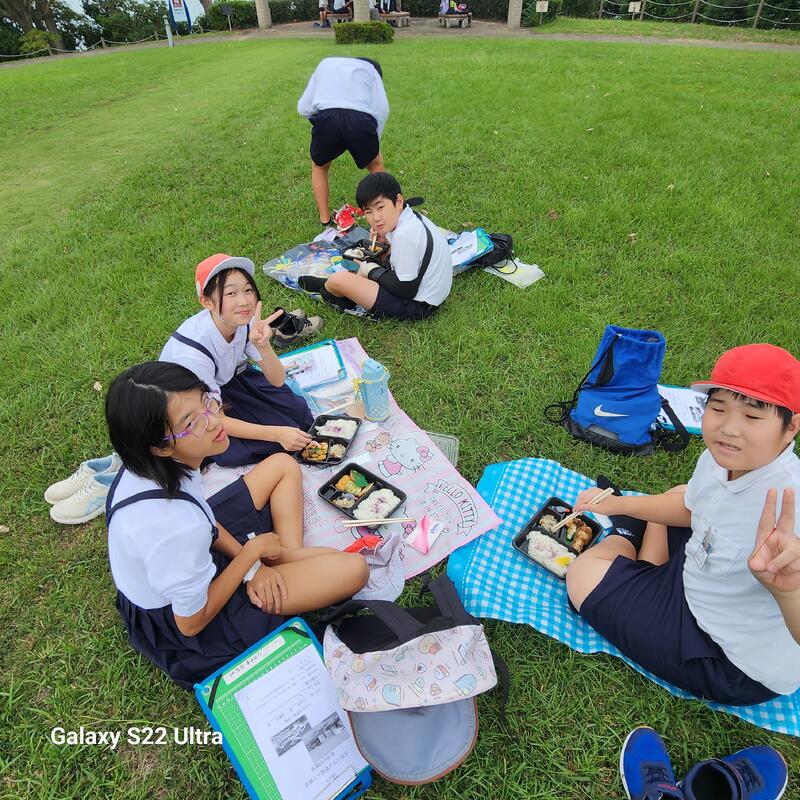 昼食は、県環境センター前の広場で海を見ながらお弁当を食べました。お昼を食べ終わった児童から環境センターの施設を見学し、実際に環境に優しい買い物の練習をしたり、海に落ちているゴミを拾う体験をしたりしながら学びました。