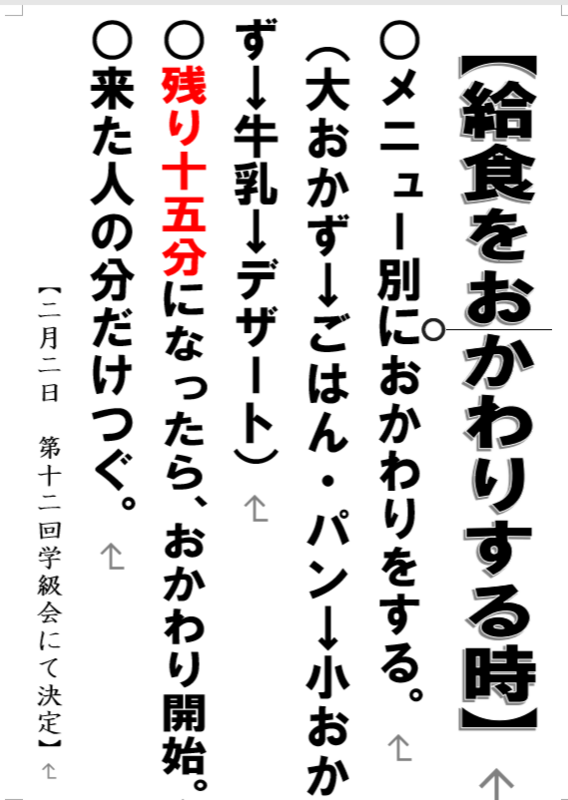 ②残り15分前におかわりをする。(委員会の放送等で教室不在となる児童がおり、平等におかわりのチャンスを得るため)
