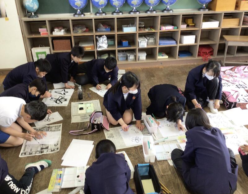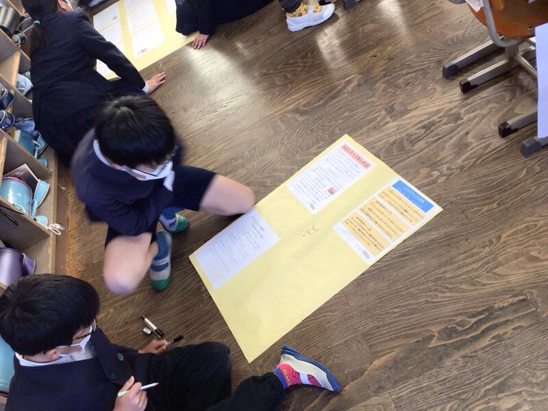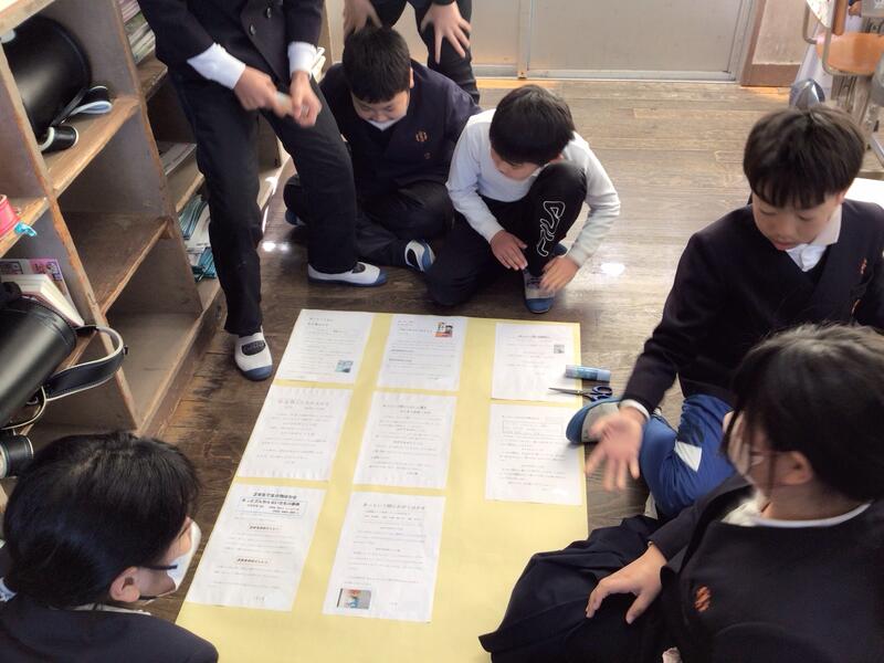 16日(金)の6時間目には、完成した文章を同じ学年毎に集まって模造紙に貼り、完成させました。来週月曜日に届ける予定です。また、教室前の廊下にも掲示しています。22日(木)にご覧下さい。