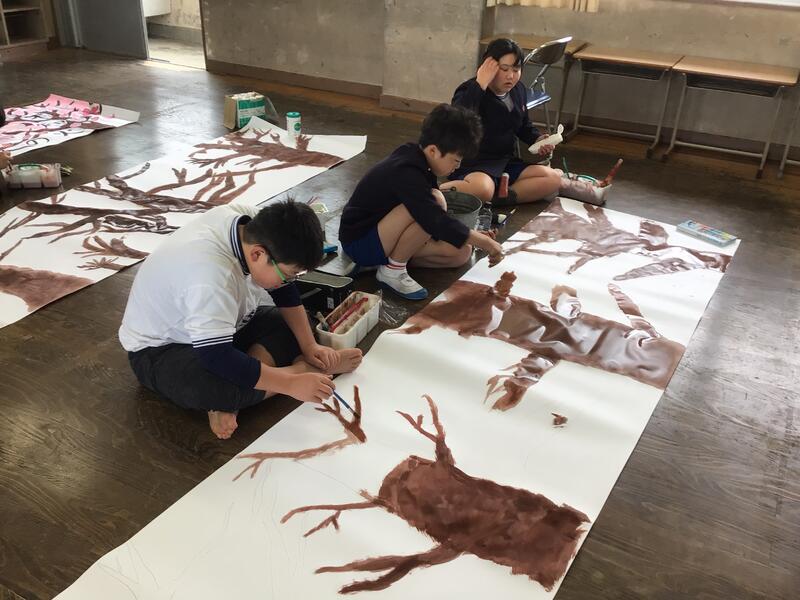 壁面掲示には、桜の木と校歌の歌詞を載せています。2番まで作成しているので、今年は、最後の3番の作成となり、今年で全て完成することになります。