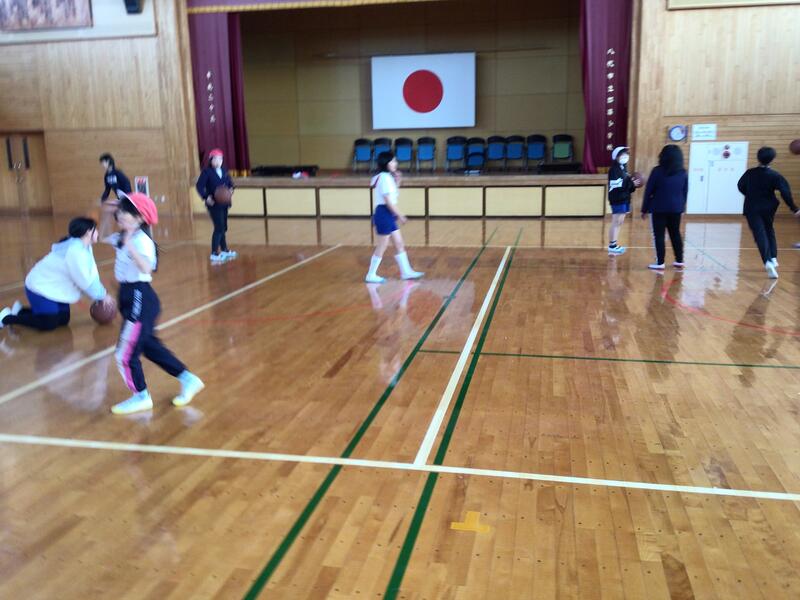 体育の授業では、ゴール型ゲームとして、バスケットボールを行っています。ボールを持っている時の動き、ボールを持たないときの動き、パスの仕方を全体でポイント確認・練習をした後、ゲームを行いました(男女別に行いました。)