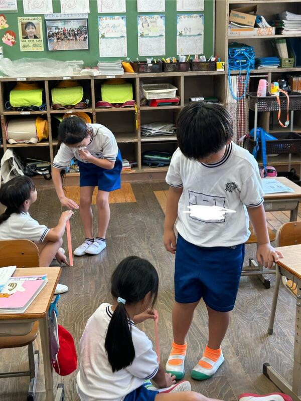 この時間では、机がドアから出すことができるか、というめあてがあり、紙テープを使って長さをはかることで、長さを比べていました。