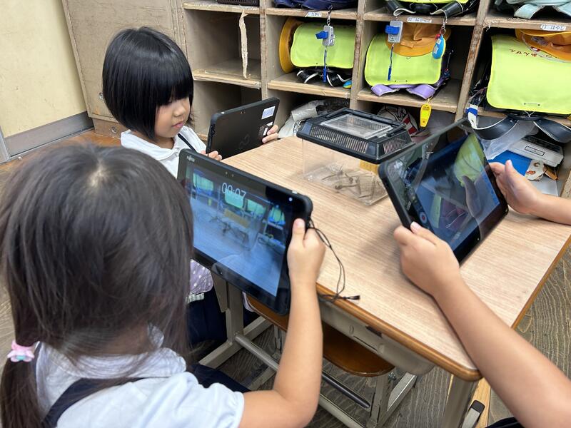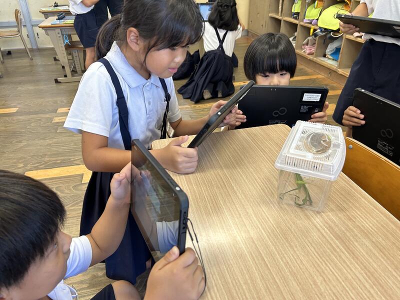 その後、タブレットで虫の様子を動画で撮ったり、虫メガネで拡大して虫の細かなところを観察したりして、虫の不思議について調べました。